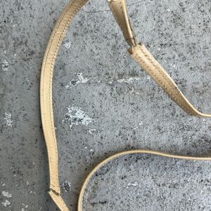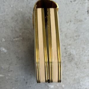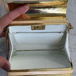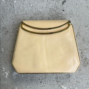 Super sweet patent leather vintage selling as a clutch because the shoulder strap is destroyed. Please look at the pictures has a little bit of discoloration but barely visible. Measuring across the bottom at its widest point is almost 7 inches across the top is almost 5.5 inches byalmost 5.5 x 1.25. Hardware is all good.