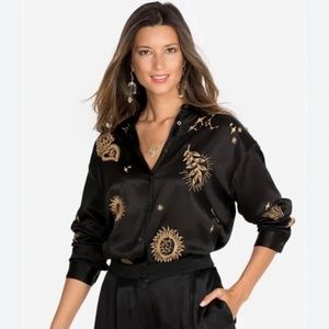 This beautiful menswear-inspired Asteria Embroidered Oversized Shirt is the perfect addition to any look. Dress it up with tailored trousers or straight-leg pants and heels. With sparkling gold detailing and an effortless fit, there are so many ways to style this on-trend top — whether you wear it in a trendy, French tuck style or tied in the front for a laid-back boho look.
