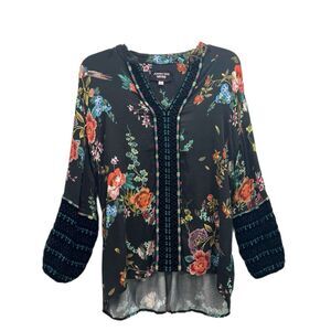 Johnny Was Embroidered Top XS Balloon Velvet Sleeves Black Floral V Neck Tunic