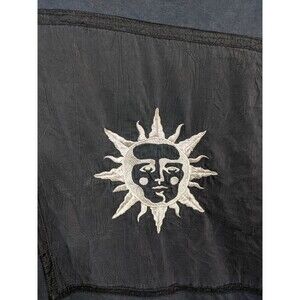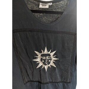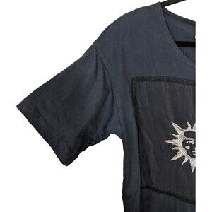 This vintage Johnny Was T-shirt midi maxi dress is a must-have for any bohemian-inspired wardrobe. The dress features an embroidered sun design, adding a touch of celestial charm to the dress. The oversized, sheer bottom feature makes it perfect for a casual day out or a party event. The dress is made of a comfortable blend of rayon and cotton, making it machine washable and easy to care for. It has a round neckline and short sleeves, making it suitable for summer, fall, and spring seasons.