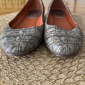 In good condition. Embossed leather with a lightly metallic finish. Leather sole and leather lined.