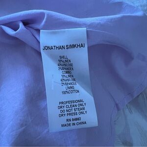 Midi length. Semi fitted bodice, relaxed skirt silhouette. Square neckline with contrast piping trim detail. Princess seams. 3/4 length, puff sleeves with elasticized cuffs. Inseam side pockets. Loops for belt (missing matching fabric belt). Light gathering below waistline. Tiered hem. Concealed back zip closure. Lined (double-layered at bodice, lined down to knee), no sheerness. Midweight, non-stretch fabric. Shell 55% linen, 43% viscose, 2% spandex - combo 55% linen, 43% viscose, 3% spandex - Lining 100% cotton. Dry clean only.