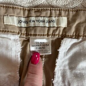 EUC excellent condition & quality! Khaki “trouser shorts” by Jones New York Jeans. Button, zipper closure. Front pockets. Long. Measurements in photos. Cotton & elastane. Stretch. Women’s size 16W. Smoke free home