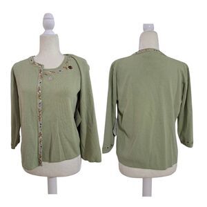 Joseph A. Women's 2 Pc Set Knit Top 3/4 Cardigan Sage Green Rhinestone Embroidered Sz XL