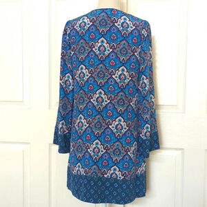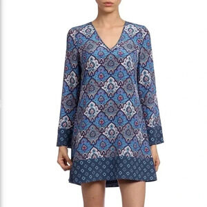 Long sleeve printed V-neck dress with bell sleeves with a different print color block detail. Silk. New with tags