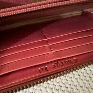 From Juicy Couture. Full zip continental wallet with multiple card slots and pockets for cash. Interior zip pocket for coins. Juicy Couture pink velour wallet with white embrodiered script brand. onfront with pink crown. Exterior does show some wear and discoloration. Have not tried to clean. Interior still in good condition with minimal signs of wear. Zippers still work well.
