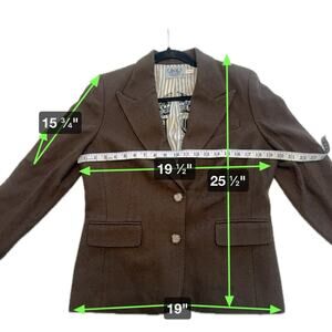 Excellent preowned condition. Faux pockets. Back vents. 100% wool shell. 100% silk lining. Well made. No flaws. Fit is on the smaller side. Please see measurements.