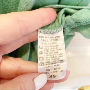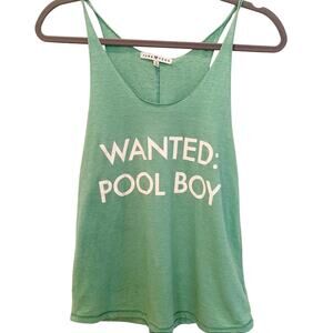 Jade green with pink text "Wanted Pool Boy" muscle tank. Raw edges. Hi/low hem. Racerback. Round neck. Poly/cotton/rayon blend. Size XS. Excellent condition.
