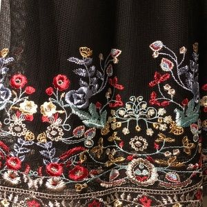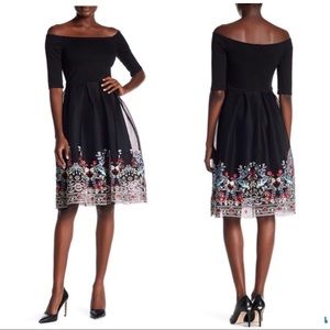 off the shoulder, 3/4 sleeves, back hidden zipper closure, fit and flare silhouette, stretch bodice, box pleated mesh skirt, embroidered skirt detail.