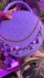 Round mini bag with croc-embossed texture. Features decorative chain and bead accents. Stylish and unique design.