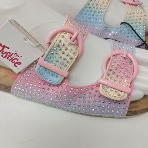 NWT. Justice Sandals. Pink and blue. Adjustable buckles. Shoe is young girls size 4. Shoe is 9.5 inches long.