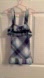 Justice Sequin Ruffle Blue Plaid Tank Top Silver Theead Trim Girls Size 12. Stylish plaid tank top. Features 3 layer ruffle detail with sequins scattered on ruffle. Cotton blend with cotton lining. Sleevesless. Ties in back. Adjustable two button straps. Perfect for casual wear. Gently used Wxcellent Preownwd Condition. Bundle kids clothes together for a great deal!