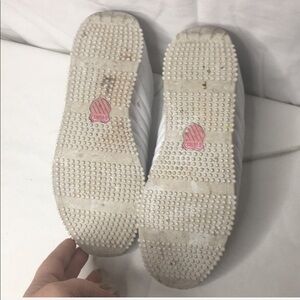 Lace up sneakers bu KSwiss in white with pink trim. Have been worn an few time and do have one dirty spot at top by ankle on left shoe. Otherwise pretty good condition. Size 5 but run large. Fit like a 6.