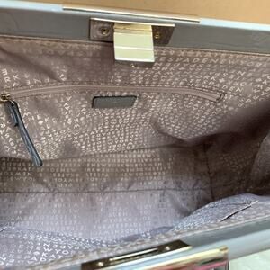 Interior lined in pale lavender signature fabric, with a zip pocket and two slip pockets.