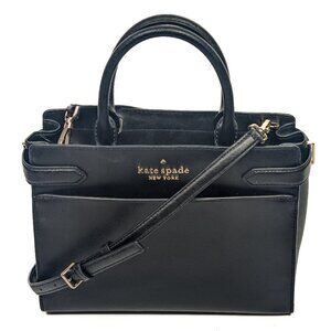 Authentic Kate Spade Saffiano leather satchel in deep black with gold tone hardware. Open front pocket, main compartment has zippered and open pockets, and is closed by top zipper to keep your items secure. Strap is removable and adjustable.