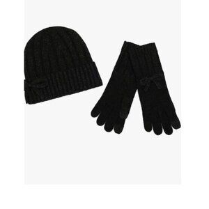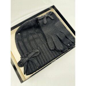 KATE SPADE metallic bow cuffed women's beanie winter hat + glove set -BLACK-2 PC