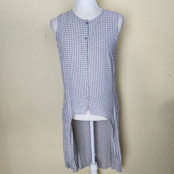 Kal Rieman Button Front Top Tunic Gingham Stone Gray White Womens Size 4 $295