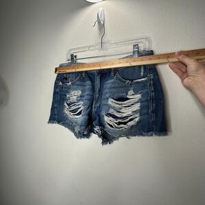 Kancan Medium Blue Wash Mid-Rise Distressed Raw Hem Denim Jean Shorts 28