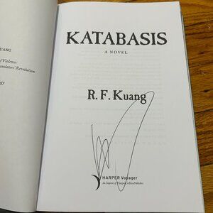 Enjoy this signed special edition of R.F. Kuang's epic new fantasy book, "Katabasis". This hardcover copy has beautiful sprayed edges that will take you right into the beautiful world Kuang has created.