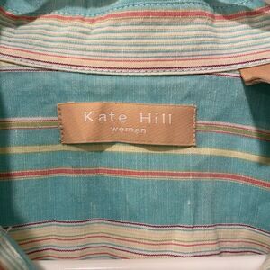 Kate Hill Blouse Womens 1X Linen Button Up Blue Striped Roll Tab Sleeve Collared