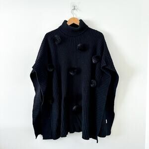 Kate Spade Cashmere Blend Faux Fur Pom Poms Front Turtleneck Poncho Black OS
