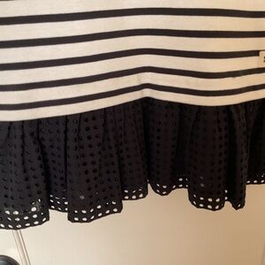 Kate Spade NY Broome street dress.. Black white striped knit dress with drop waist, slightly flouncy ruffle trim skirt, 3/4 sleeve.