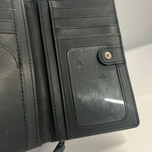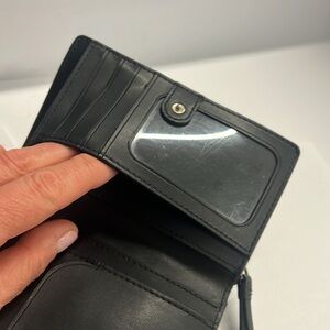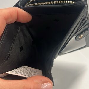 This is a wonderful Kate Spade New York Compact Vertical Snap Bifold Zip Around Wallet. Goldtone hardware. Snap opens to 8 credit card slots, an ID window, 4 additional slip in compartments, a currency slot, a zipper opens to anothet double compartment. Fully satin lined. No odors. No tears. 5.5” x 3.5”