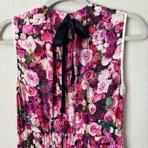 Solid back neck tie, flared skirt, pleated front and back, printed