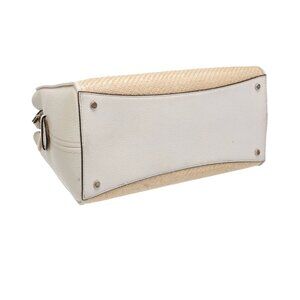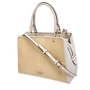 This elegant Kate Spade New York top handle bag is crafted with a neutral straw material and enhanced with gold-tone hardware, offering a sophisticated look that's perfect for any occasion. Featuring rolled handles, an adjustable shoulder strap, and leather trim embellishments, this bag combines style with functionality. The interior includes a signature logo jacquard lining with three pockets for easy organization, and the protective feet at the base keep it secure.