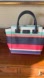 See photos of flaws: small markings where color of handles transferred to bag. Slight rubbing on corners. Otherwise it’s a beautiful fun bag! Interior is very nice and clean, navy KS jacquard lining. One zipper pocket and two slip pockets.