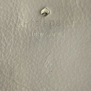 The Kate Spade Wristlet Clutch Wallet in gray and oatmeal features a solid color with pebbles texture, made of leather. It is a small size with a zipper closure and logo accents. Designed with multiple credit card slots, this wristlet is perfect for women who value both style and functionality in their accessories. The classic Kate Spade logo adds a touch of sophistication to this chic and practical wallet.