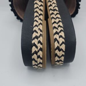 Elegant black espadrille slides with ruffle detail. Comfortable and stylish for casual wear.