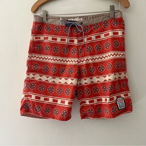 Custom Board shorts by Katin in a red/orange clay color with Aztec print feature back pocket, logo patch and tie waist