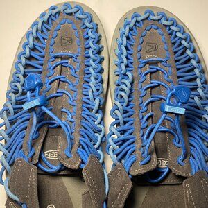 Keen Uneek blue and aqua paracord bungee pull-on sandals. Men's size 10.5M. Drawstring with logo-ed pull tab. Anatomical footbed. Great for hiking, outdoors, fishing, etc. Excellent used condition.