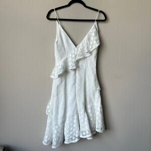 Keepsake 'See You Now' polka dot ruffle dress in crisp white. Gorgeous dress for a bridal paty or bachelorette trip, this playful dress has a deep V neckline, spaghetti straps and a cascading knee-length silhouette. Asymmetrical ruffle details with cute varying sizes of polka dots all over. Back zipper closure. Fully lined. Size small - 16.5" pit to pit; 13.5" waist; 31" at longest point from pit to hem.