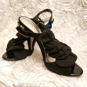 Kelly & Katie Black Satin Ruffle T-Strap Strappy Open Toe Heels Women's Size 6