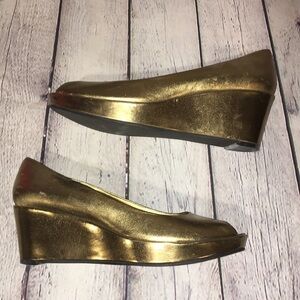Kelly & Katie gold platform peep toe wedges