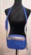 Used condition, It features a blue and silver color scheme with a perforated front panel and a decorative tassel on the side. The bag has a zipper closure and an adjustable strap that includes a chain detail.