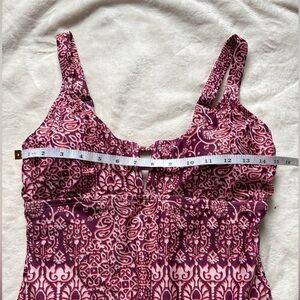 Stylish and supportive one-piece swimsuit from Kona Sol in a beautiful maroon and pink medallion print. Features adjustable shoulder straps, removable padded cups, and a flattering V-neckline with subtle front keyhole detail. Great for beach days, pool lounging, or active swim sessions.