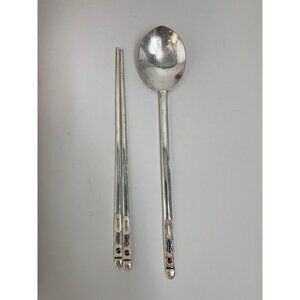 This vintage 14-piece Korean Flatwear set includes silver-plated spoons and chopsticks. Ideal for bringing a touch of elegance to any dinner setting. Perfect for the host who appreciates classic style and quality.