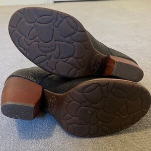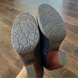 Kork-Ease Castaneda ankle booties in black leather with a brown wedge heel. Super boho/chic and can be worn with skirts, dresses, or pants. Back zipper. Fantastic condition. True to size.