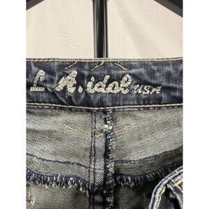 Stylish LA Idol USA jeans in great condition. Features heavy white contrast stitching, embellished studded back flap pockets, and a dark wash with slight fading for a classic look. No interior size tag, please see measurements for accurate fit.