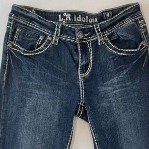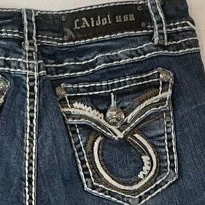 L.A. idol USA Medium wash Bootleg Jean with Embroidered Back Flap Pockets. 97% Cotton/3% Elastane
