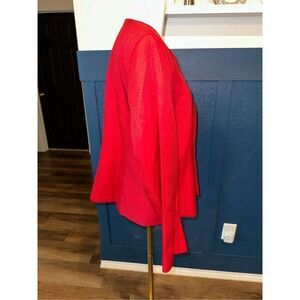 Size 16 | Cherry Red | Open combo jacket with hook and eye at centerfront. Jacket includes shoulder padding and no pockets. Combo straight skirt with invisible zipper at centerback and no pockets. Length of jacket is 23 in. and length of skirt is 24.5-in.
