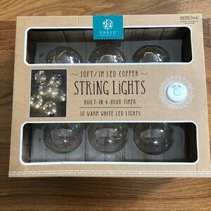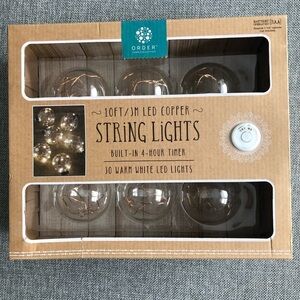 10 ft Decorative LED lights with built in 4 hour timer. 30 Warm White LED lights. Requires 3 AA batteries.