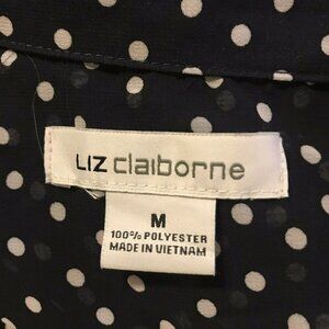LIZ CLAIBORNE. Size M. Semi Sheer Sleeveless Top w/ attached Cami. Black with white dots. Bust 42". Center back length is 27.5". Button front. Polyester. Excellent pre-loved condition. No spots, tears or damage.