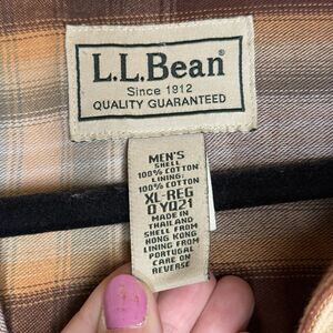 The L.L.Bean Men's XL Work Shirt is a durable and versatile flannel lined tan canvas shirt jacket, perfect for casual occasions. Made from cotton with a solid brown color and button-up closure, this shirt features a collared neckline and long sleeves for added warmth. With a regular fit and lined design, it also includes convenient pockets for added functionality. Imported from Thailand, this button-up shirt is a classic addition to any man's wardrobe.