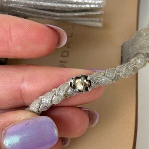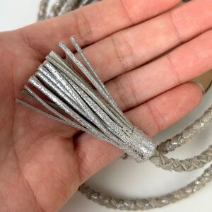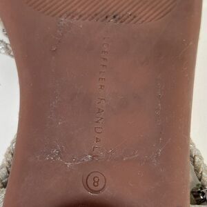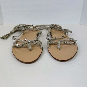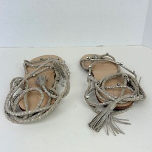 Loeffler Randall Bo Crystal Embellished Braided Metallic Ankle Tie Sandals. These flat sandals feature a beautiful wheat shade leather with silver metallic sheen. Braided straps create laced front detail with fringed tassel accented wrap ankle tie closure accented by stunning rhinestones. Leather with flat rubber sole. Women's size 8 Very good used condition - final photo shows 1 missing rhinestone.