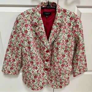 Fully Lined. Measurements for flat lay bust, length and sleeve depicted. Shoulder pads. Notch collar. Slash pockets.