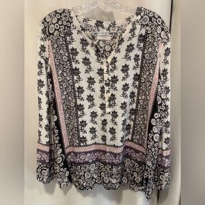 LOFT Women's Tunic, 5-Button Front, Black & White Floral w/Pink Border; Size S